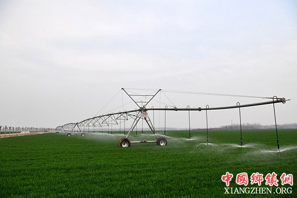 在河南省许昌市建安区陈曹乡尚庄村,电动平移喷灌机为麦田浇水(3月14日摄)。
