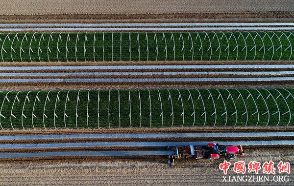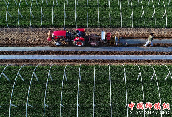 乐亭县中堡镇北东村农民在使用机械设备播种花生(5月3日摄)。 暮春时节,河北省乐亭县农民抢抓农时进行春播和田间管理。