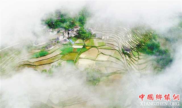 5月6日清晨,云雾缭绕的酉阳花田乡梯田。花田乡何家岩村的梯田、房屋、青山在雾中若隐若现,宛若人间仙境。目前,该村依托当地自然条件,正积极发展乡村旅游。