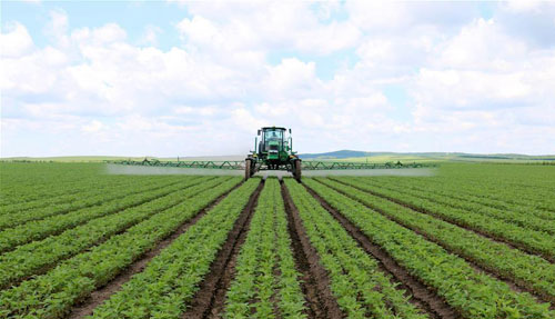 6月28日,黑龙江五大连池农场职工驾驶喷药机为大垄密植大豆喷施营养液。