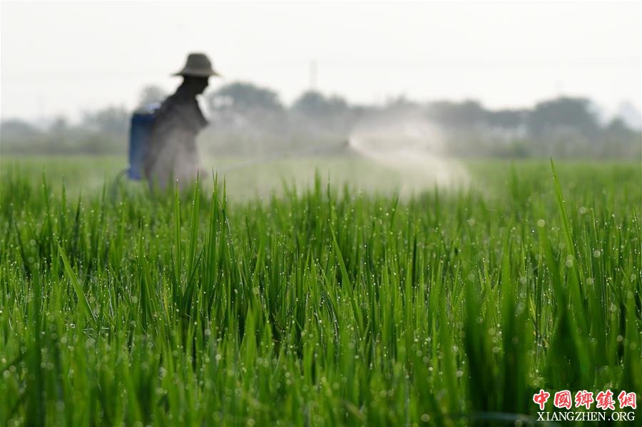 8月2日,安徽省肥西县丰乐镇三里村农民在水稻田间喷洒农药。