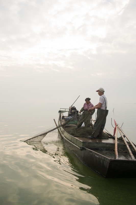 9月12日,浙江湖州吴兴区幻溇村渔民在太湖上捕鱼。