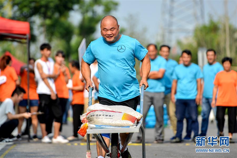 9月15日,在浙江省湖州市长兴县煤山镇文体中心,人们参加独轮车项目竞赛。