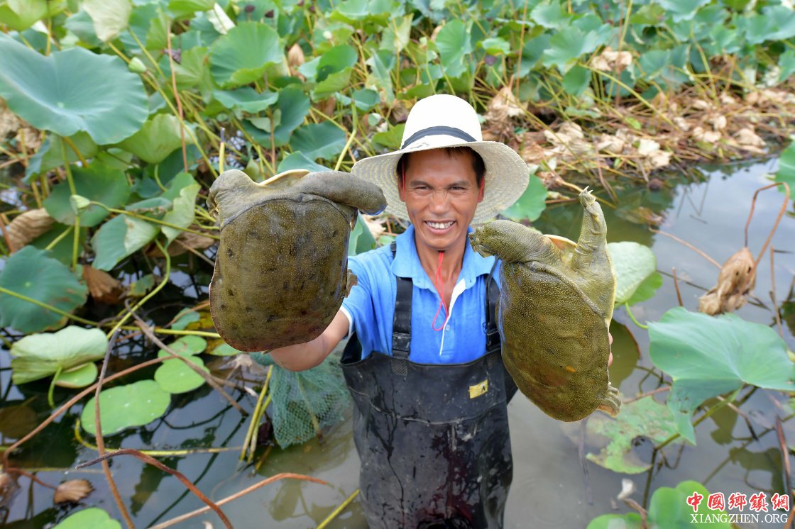 9月17日,农户在江西省南昌市新建区联圩镇鄱阳湖生态白莲产业园展示刚捕捞的甲鱼。