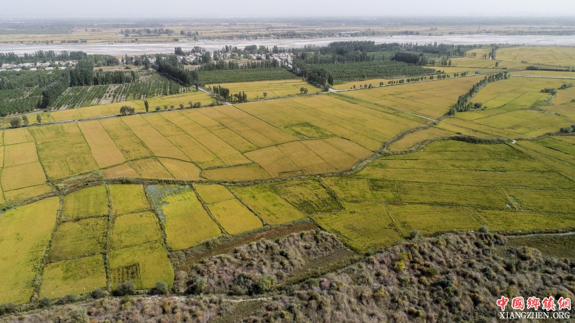 新疆温宿县托甫汗镇阿亚克其村一处待收割的稻田(9月23日无人机拍摄)。
