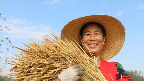 10月11日,在江苏省灌云县圩丰镇大兴村,农户在田间收获水稻。 金秋时节,农民们在田间忙着收获成熟的农作物,喜迎丰收。 新华社发(吴晨光 摄)
