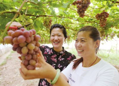 游客在廊坊市固安县盛世农合专业种植合作社的基地里采摘葡萄。门丛硕摄