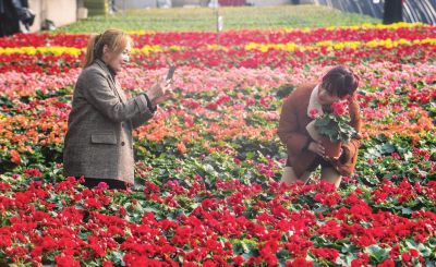 游客在廊坊市永清县刘街乡胜利村花卉温室拍照留念。陈辉摄