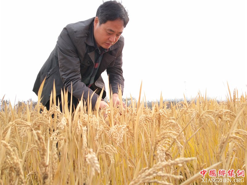 郯城县马头镇工作人员在观看晚熟圣稻22的生长情况。