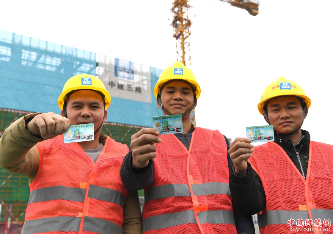 1月10日,在广西柳州市柳东新区中建三局一公司南宁公司启元广场项目建设工地,农民工展示自己刚刚办理的专属工资卡。