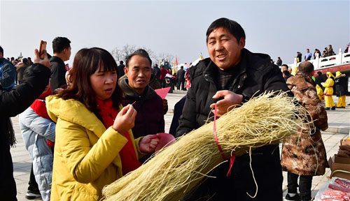 当日,河南省鲁山县观音寺乡西桐树庄村土特产年货展销活动在河南鲁山阿婆寨风景区门口举行。近年来,依托乡村旅游的不断发展,不少贫困山村特产走出大山。