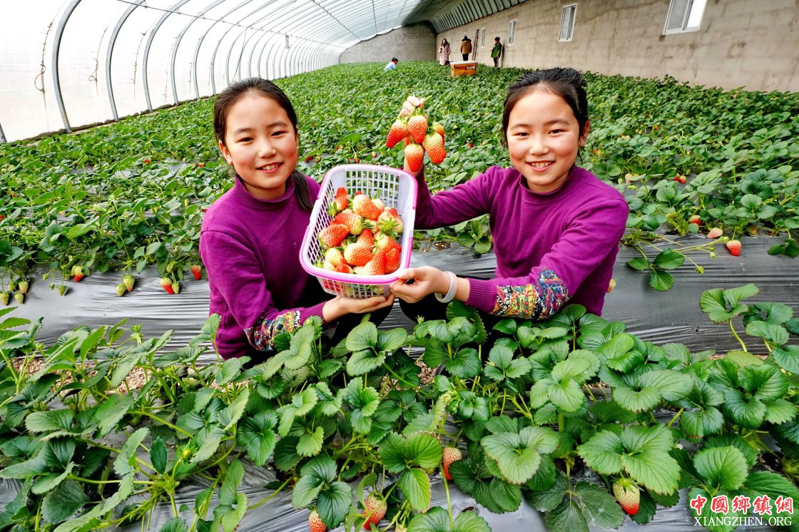 1月20日,一对孪生姐妹在滦州市滦城街道办事处辖区的一家采摘园内展示她们采摘的草莓。