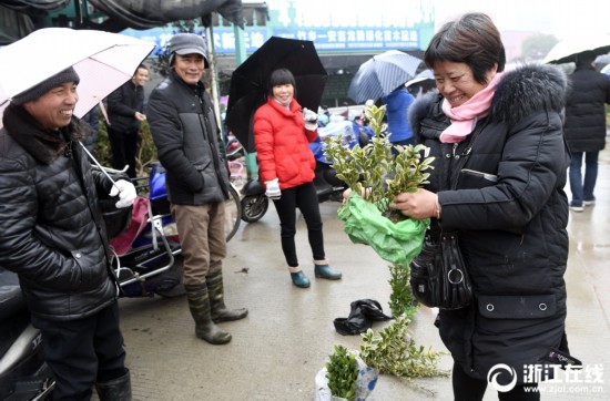 2月14日,天刚亮,在浙江花木城,来自杭州萧山新街、瓜沥及周边的百余苗农赶到市场交易苗木。现场,熙熙攘攘,刚过完年的苗农早早地来赶集,以便在市场上卖个好价钱。瓜沥苗农萧国庆说,他承包了10多亩地种植苗木,预计今年有10多万元的收入。(吴元峰)