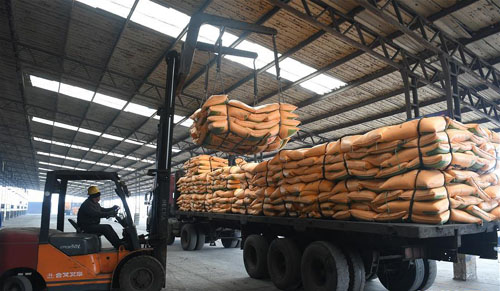 2月21日,工人在山西运城市稷山县一化肥生产企业装运化肥。