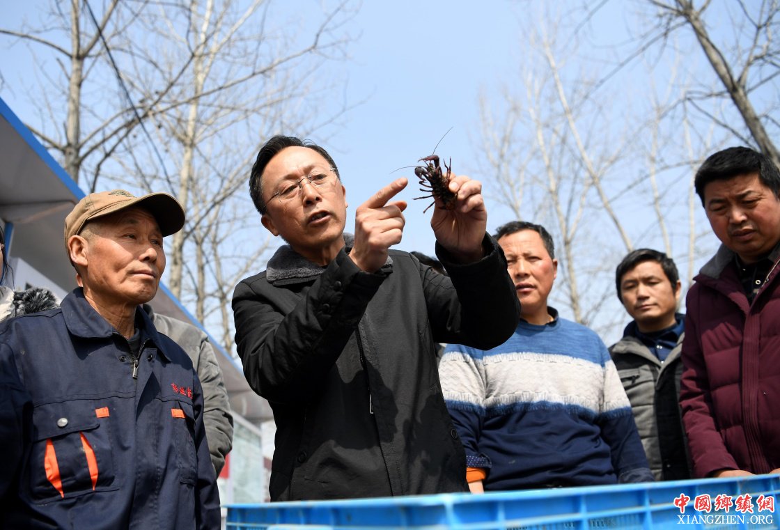 3月6日,技术人员在五河县沱湖乡大岗村沱湖稻虾共作养殖基地向贫困户及村民讲解小龙虾养殖知识。