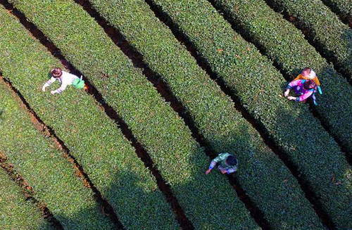 3月12日,在广西柳州市融水苗族自治县红水乡振民村的茶园里,当地妇女在采摘明前茶(无人机拍摄)。 春回大地,人们纷纷投入到忙碌的生产劳动中。 新华社发(韦鼎标 摄)