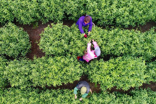 3月15日,江西省吉安市永丰县七都乡的茶农正在采摘春茶(无人机拍摄)。 新华社发(刘浩军 摄)
