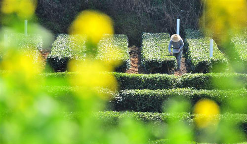 3月16日,湖北省宜昌市夷陵区太平溪镇茶农在早茶园里采摘春茶芽。 新华社发(张国荣 摄)