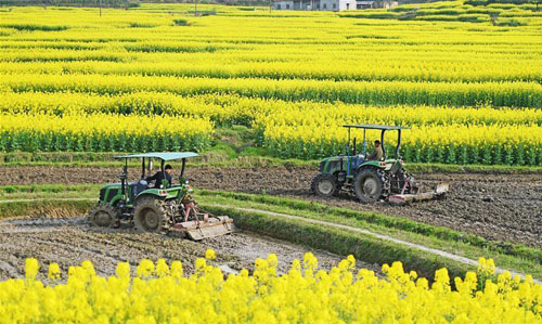 3月19日,在江西省宜春市袁州区彬江镇英山村,农民驾驶农机在田间作业。 春分将至,各地农民抢抓农时春耕春播,田间地头到处是一派繁忙景象。 新华社发(刘继刚 摄)