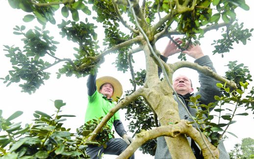 3月19日,长沙市雨花区跳马镇育景园苗木基地,苗木造型师在给一株无刺枸骨树造型。近年来,该镇积极推动花卉苗木产业转型升级,实现精品化、品牌化,培养出了一批苗木造型师,造型师可以让苗木的价值倍增。(记者 田超 通讯员 吴丹梅 摄影报道)