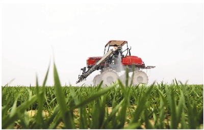 图为3月20日,山东省滨州市沾化区冯家镇农机手操作高地隙喷杆喷雾机为当地种粮大户张汝和的1800亩小麦进行喷防作业。 |