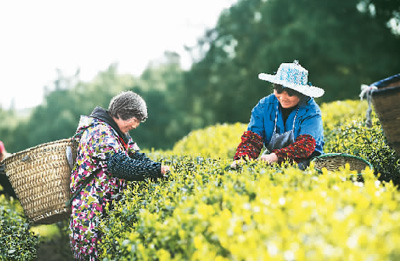 图为重庆市巴南区白象山定心茶园的茶农在采摘春茶。 |