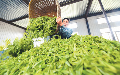 图为湖南省浏阳市淳口镇银峰茶场刚刚采摘的新茶。目前,浏阳市淳口镇形成了以银峰、淳峰两大茶场为龙头,散户为补充的茶叶种植格局,全镇茶叶种植总面积达1.18万亩。预计今年全镇春茶产值将超5000万元。 |