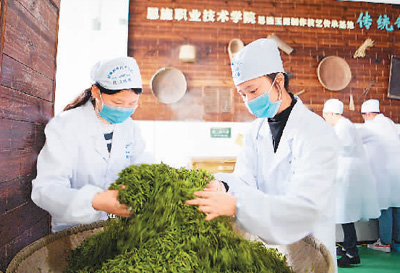 湖北省恩施土家族苗族自治州茶叶种植面积过百万亩,近日进入春茶采摘季。近年来,恩施职业技术学院着力服务当地茶产业发展,投资数百万元建设了“恩施玉露”制作技艺传承基地,为当地茶产业的发展提供实用性人才,助力当地脱贫。图为学生正在传承基地学习制茶。 |