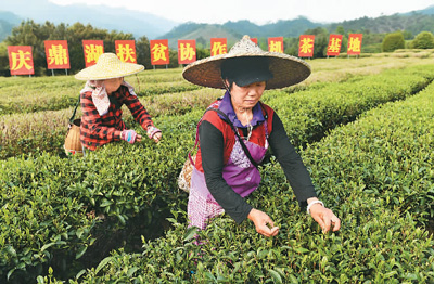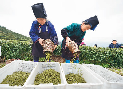 贵州省黔东南苗族侗族自治州丹寨县“扶贫茶园”的春茶陆续进入采摘期。图为采茶工采摘春茶。 |
