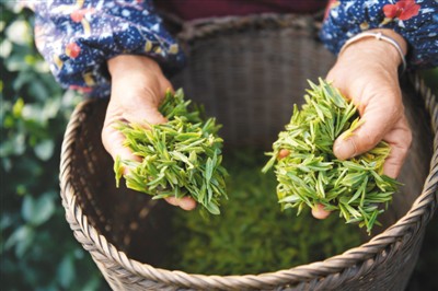 近日,西湖龙井茶保护区内的龙井村、龙坞村、翁家山村、杨梅岭村等地茶农和采茶工陆续开始采摘今年第一批西湖龙井茶。图为采茶工在展示采摘到的茶树新叶。 |