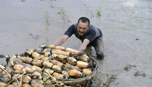 4月9日,湖北省来凤县漫水乡桶子村的村民在藕田里拖运藕苗。 时值种藕季,湖北省恩施土家族苗族自治州来凤县漫水乡的藕农忙着打理藕田、下种,一派忙碌景象。 新华社发(唐俊 摄)
