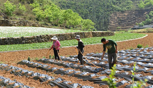 4月17日,云南西畴县蚌谷乡龙正村农民在地里浇灌刚种植的经济作物。 时下,云南省文山壮族苗族自治州西畴县进入春耕生产季节,田间地头一派忙碌景象。 新华社记者 杨宗友 摄