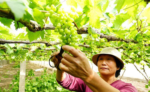 4月21日,河北省昌黎县十里铺乡十里铺村的一位果农在大棚内给葡萄疏果。新华社记者 杨世尧 摄