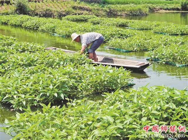 村民收割池塘藤藤菜。