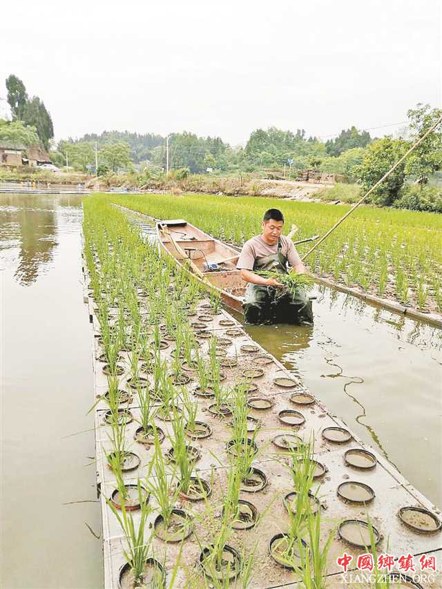 4月22日,垫江县周嘉镇爱国村一口60亩大池塘里,创业青年欧勇划着一条小船忙个不停:他要用浮板开辟出10亩“水上土地”,为即将栽种的“五彩稻田”作准备。