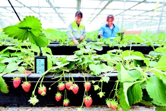 5月11日,依据土壤水分温度传感器提供的精准数据分析,工人在贵安新区贵澳农旅产业示范园高效蔬果种植采摘体验馆针对性管护草莓。