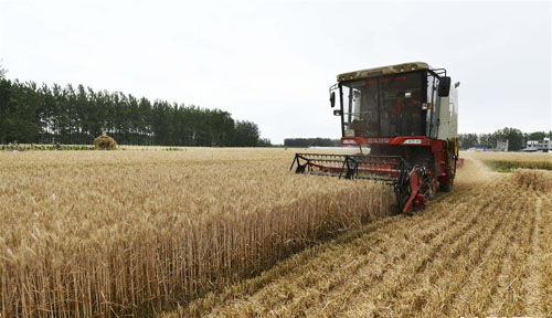 5月28日,在安徽省阜阳市临泉县吕寨镇杨庄村,村民在田间收割小麦。 新华社发(卢启建 摄)