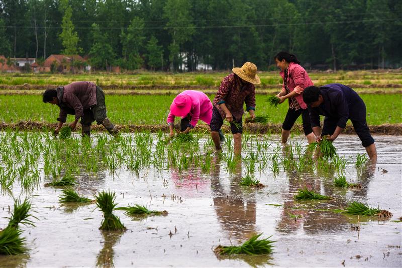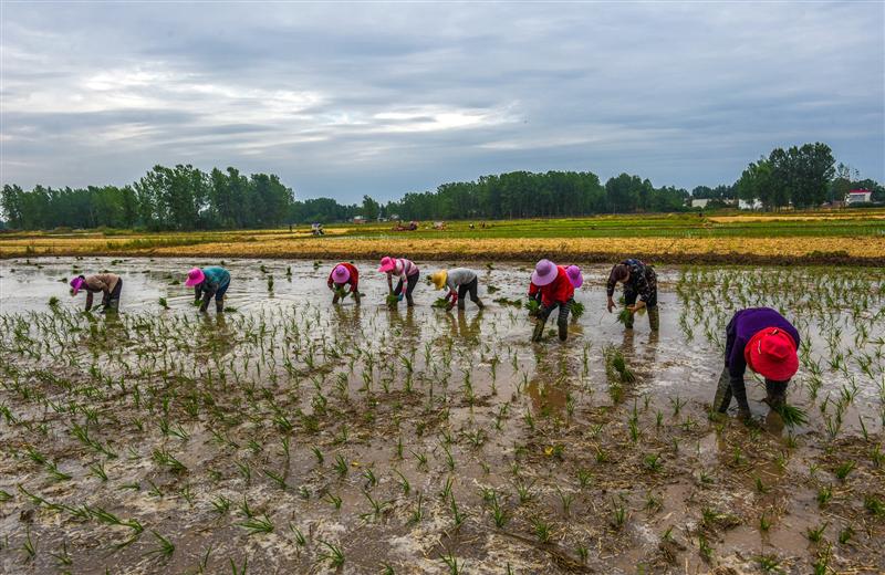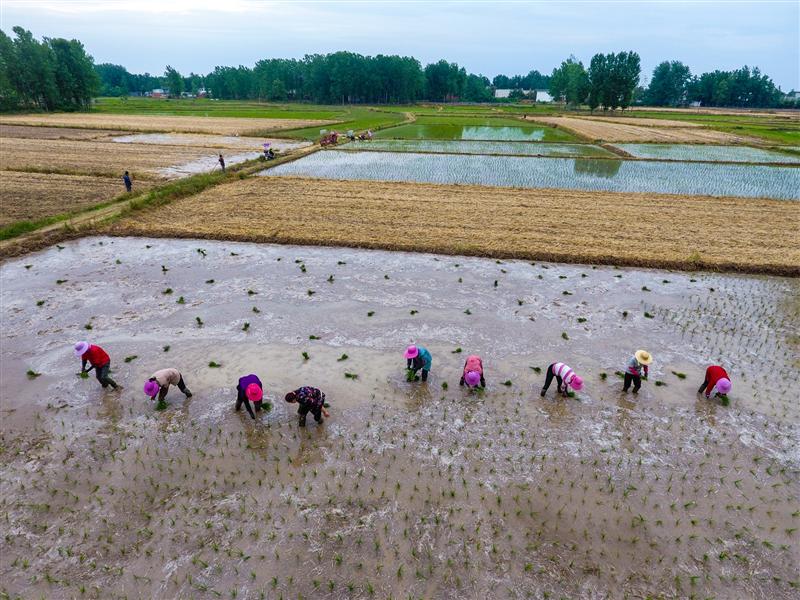 5月30日,河南省正阳县大林镇汤庙村的村民正在忙着插秧。小麦收割后,麦茬犁起,抽水、整田、插秧,人正忙。眼下,正阳县南部四乡镇25万亩麦茬稻迎来插秧高潮,处处一派繁忙景象。