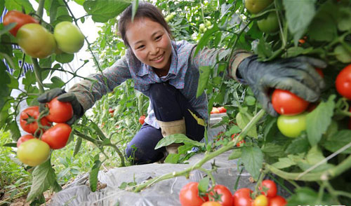 6月24日,贵州省毕节市黔西县文峰街道田坎社区农民在采摘西红柿。 新华社发(周训超 摄)