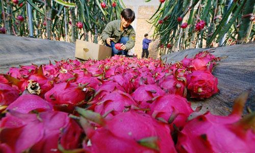 12月5日,河北省滦州市鸡冠山生态农业产业园的工人在温室大棚内采摘火龙果。 入冬以来,冀东地区的唐山、秦皇岛等地农民纷纷投入冬季暖棚果蔬的管理、收获、农产品加工等工作中,变“冬闲”为“冬忙”。 新华社记者 杨世尧 摄