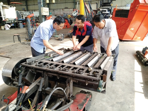 郑志安(左一)与山东国丰机械有限公司技术工程师在研讨中药材收获机试制。资料图