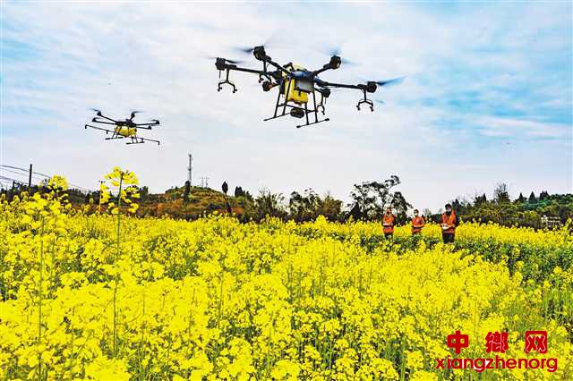 2月29日,大足区万古镇升斗村,植保无人机正在油菜地里作业。据了解,大足区年均植保面积48万亩,近年来通过引进推广节水、节药、高效的植保无人机等现代植保机械,与传统人工防治相比效率提高60倍以上,为农业丰产丰收打下坚实基础。
