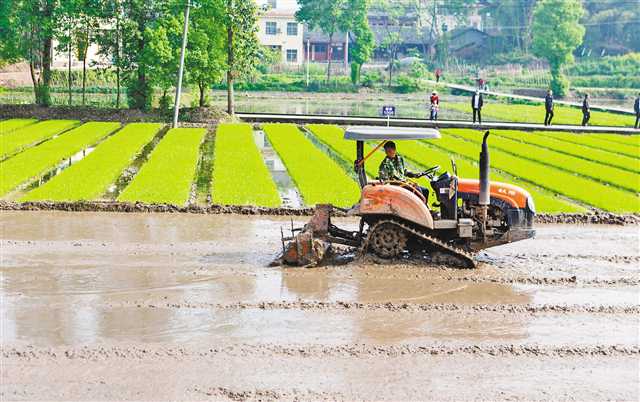 4月14日,大足区拾万镇长虹村,工作人员正在进行机耕作业。
