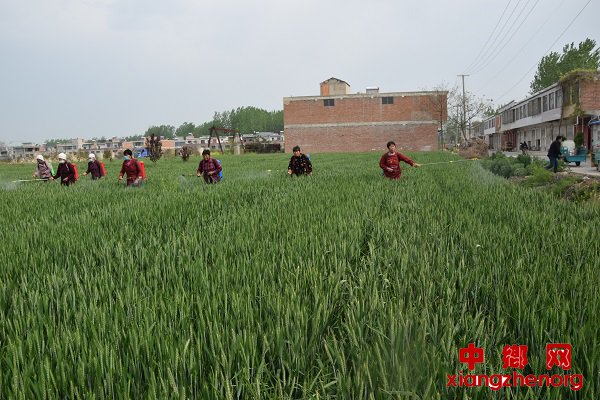 中乡网安徽讯 4月16日,安徽省亳州市谯城区古城镇古城村委会农民正在南园村麦田里喷撒防治病虫害药物。