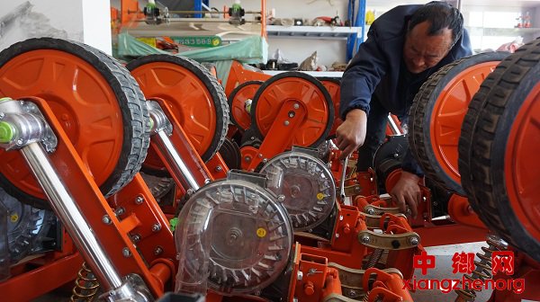 农机人员在该区插花镇宏伟农机专业合作社检修玉米播种机