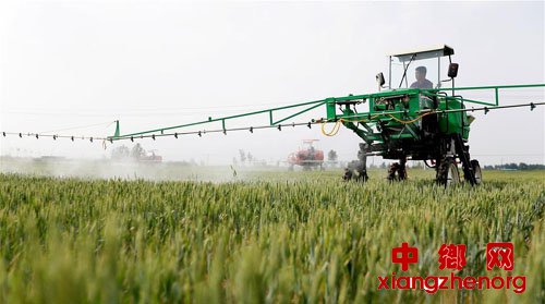 5月17日,在山东青岛市即墨区段泊岚镇毛家岭四村,青岛浩硕农机专业合作社技术人员使用自走式高杆喷雾机在麦田里作业。新华社发(梁孝鹏 摄)