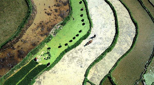 5月22日,在贵州省黔东南苗族侗族自治州榕江县八开镇摆奶村,农民在梯田劳作(无人机照片)。 初夏时节,农民在田间劳作的身影构成一幅幅优美画卷。 新华社发(王炳真 摄)