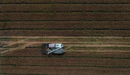 5月24日,农户驾驶收割机在浙江省湖州市吴兴区八里店镇尹家圩粮油植保农机专业合作社的麦田里进行收割作业(无人机照片)。 新华社记者 黄宗治 摄
