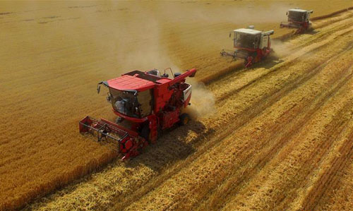 6月8日,联合收割机在河北省南和县闫里乡闫里村麦田进行夏收作业(无人机照片)。 “三夏”期间,河北省预计组织和调度小麦联合收割机、拖拉机、夏玉米播种机等200万台农业机械投入作业。 新华社记者 朱旭东 摄