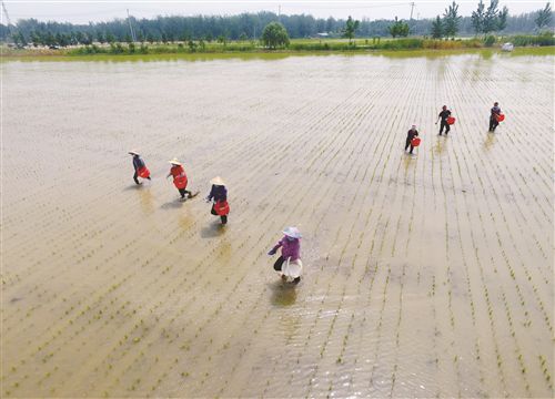 邳州新河镇袁场村村民正在给秧苗施肥。